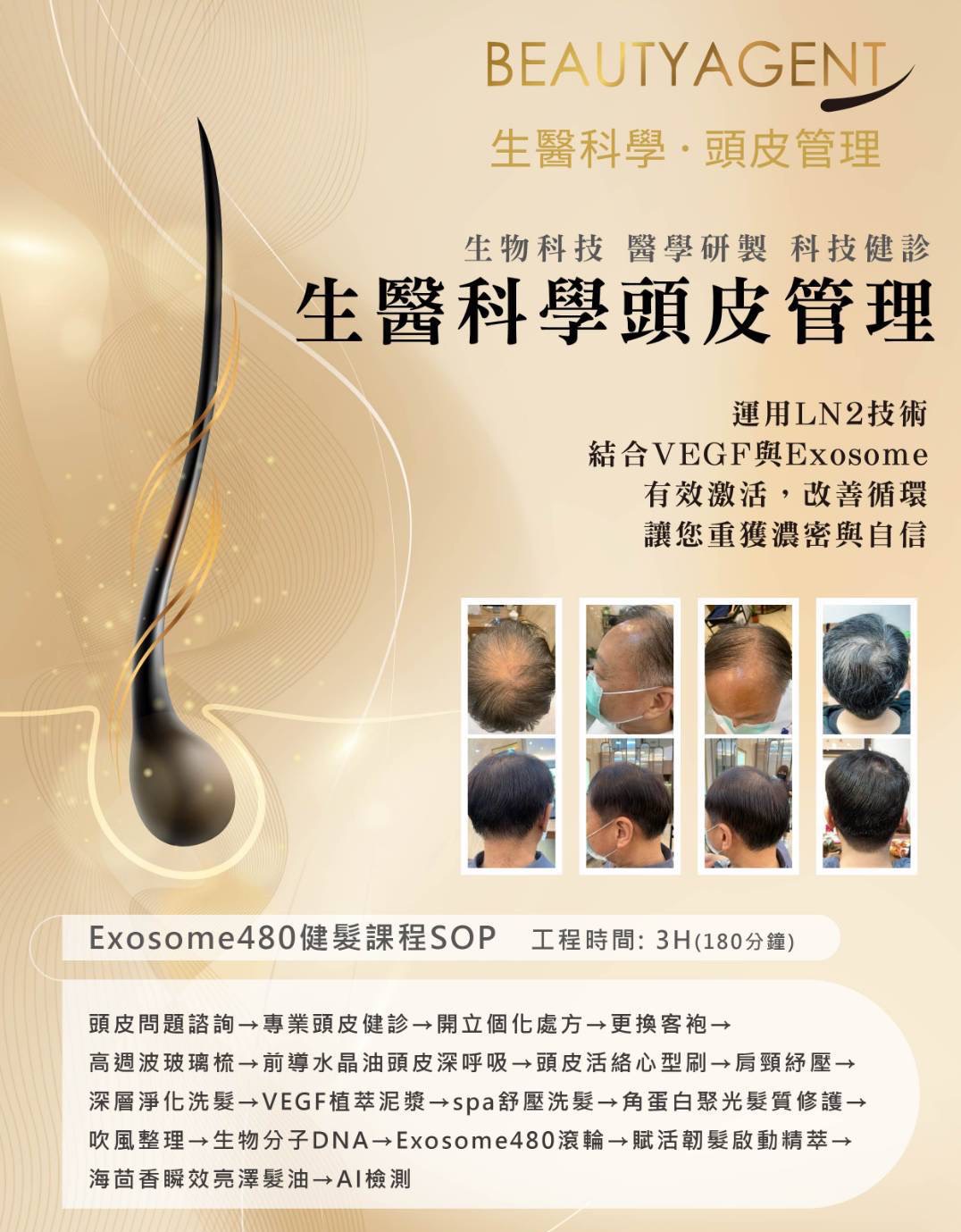 Exosome480健髮 結合VEGF與Exosome 有效激活 改善循環 讓您重獲濃密與自信 課程時間: 約3小時 適合族群: 長期壓力大、睡眠品質不佳 ✔️ 清除老廢角質及化學殘留 ✔️ 提升頭皮彈性增加微循環 ✔️ 深層補水修護 追求精緻生活 重視預防 課程流程: 頭皮問題諮詢→專業頭皮健診→開立個化處方→更換客袍→高週波玻璃梳→前導水晶油頭皮深呼吸→頭皮活絡心型刷→肩頸終壓→深層淨化洗髮→VEGF植萃泥漿→spa舒壓洗髮→角蛋白聚光髮質修護→吹風整理→Exosome480滾輪→賦活韌髮啟動精萃→海茴香瞬效亮澤髮油→AI檢測