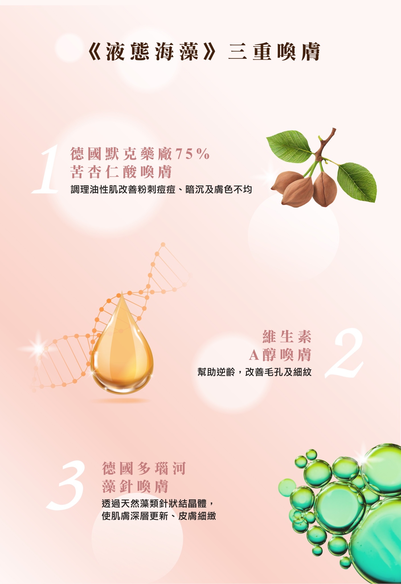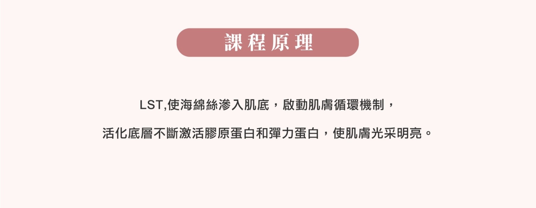 LST,使海綿絲滲入肌底,啟動肌膚循環機制, 活化底層不斷激活膠原蛋白和彈力蛋白,使肌膚光采明亮。