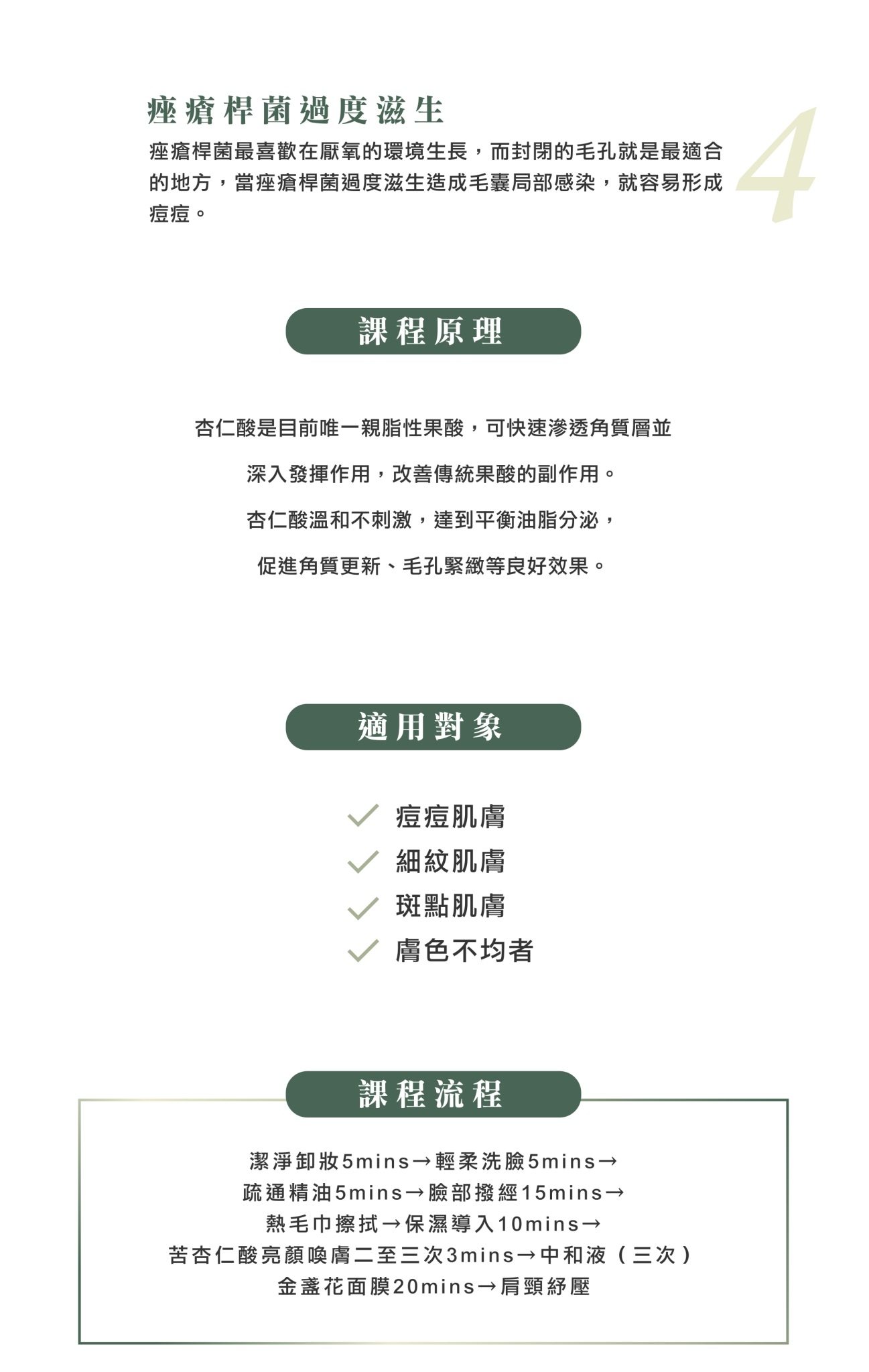 杏仁酸是目前唯一親脂性果酸,可快速滲透角質層並 深入發揮作用,改善傳統果酸的副作用。 杏仁酸溫和不刺激,達到平衡油脂分泌, 促進角質更新、毛孔緊緻等良好效果。 適用對象 √ 痘痘肌膚 √ 細紋肌膚 √ 斑點肌膚 √ 膚色不均者